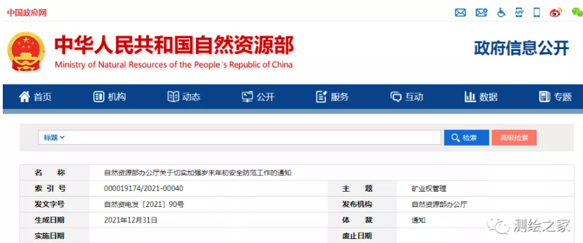 资讯分享 | 自然资源部印发通知:切实加强岁末年初安全防范工作 2022/1/1 0:00:00 自然资源部办公厅关于切实加强岁末年初安全防范工作的通知各省、自治区、直辖市自然资源主管部门,新疆生产建设兵团自然资源局,中国地质调查局及部其他直属单位,各派出机构: 2022年是我国踏上全面建设社会主义现代化国家、向第二个百年奋斗目标进军新征程的重要一年,做好岁末年初安全防范工作,确保安全形势稳定,意义重大。按照《中共中央办公厅 国务院办公厅关于做好2022年元旦春节期间有关工作的通知》总体要求和国务院安委会办公室 应急管理部关于岁末年初全国安全防范工作紧急视频会议的部署安排,为切实做好风险防控和隐患排查治理,坚决遏制重特大事故发生,确保岁末年初自然资源领域安全生产形势稳定,现就有关事项通知如下: 一、牢固树立安全发展理念,层层压实安全生产责任 时值岁末年初,安全生产不稳定不确定因素明显增多,煤矿等领域安全生产事故时有发生,安全形势依旧十分严峻。各地区、各单位要牢固树立安全发展理念,时刻保持清醒头脑,从讲政治的高度增强防范化解重大安全风险的主动性自觉性,始终坚持人民至上、生命至上,统筹发展与安全,切实守牢安全防线。要认真贯彻落实习近平总书记关于安全生产重要论述和李克强总理等中央领导的批示要求,深入研判岁末年初安全生产工作规律特点,采取有效防范管控措施,确保岁末年初安全形势稳定。各单位主要领导要切实担起领导责任,敢于动真碰硬,担当作为,拧紧责任链条,压实工作措施,强化督导检查,切实提高工作的针对性时效性,以实际行动和实际效果做到“两个维护”,全力为明年举办冬奥会和召开全国“两会”营造良好安全环境,确保人民群众安度欢乐祥和的元旦和新春佳节。 二、省级自然资源主管部门要开展全面检查 各省、自治区、直辖市自然资源主管部门,新疆生产建设兵团自然资源局要在本级人民政府安委会的统一领导下,严格按照“三个必须”和“谁主管,谁负责”原则,认真履行安全生产管理职责,持续推进安全生产专项整治三年行动,配合开展打击整治枪支爆炸物品违法犯罪、危险化学品安全生产监管、国家海上搜救应急处置、铁路沿线安全环境治理等专项工作。认真汲取山西孝义市盗采煤炭透水事故教训,在煤炭保供大背景下,要对潜藏的安全生产风险提高警惕,盯紧盯牢煤矿、非煤矿山等重点领域,加强动态巡查,严格监督执法,对各类矿产资源违法违规行为保持高压态势,进一步强化监管责任落实,防止因非法开采引发重大安全事故,确保安全生产底线不失守。 要结合实际,通过“四不两直”等方式,全面开展自然资源领域安全生产监督检查,对发现的问题要制定“两个清单”,抓好整改落实,对各类自然资源违法行为,要坚决依法查处,决不留死角盲区、杜绝安全隐患。检查重点包括:(1)开展安全生产管理的主要做法与成效;(2)学习贯彻习近平总书记关于安全生产重要论述和指示批示精神情况;(3)建立完善与落实安全生产责任制,强化安全生产管理制度、标准规范建设情况;(4)安全事故隐患排查治理情况;(5)用地用矿用海批后监管情况;(6)无证勘查开采和越界采矿等自然资源违法违规行为查处情况包括通过领导批示、媒体舆论报道、群众举报等渠道反映违法违规行为处置情况;(7)安全生产专项整治三年行动工作进展情况;(8)地质勘查、测绘行业安全生产管理责任落实情况;(9)组织及配合相关部门开展安全生产相关专项行动情况等。 三、部属单位要强化安全风险隐患排查治理 中国地质调查局和部其他直属单位、各派出机构尤其是直属地质勘查、测绘单位和航船科考单位,要结合实际,举一反三,严格按照安全生产管理职责分工,主要领导认真履行第一责任人责任,分管领导要靠前指挥,确定牵头部门,细化目标任务,逐级压实责任,按照部综治办印发的《关于做好2022年冬奥会和冬残奥会期间安全防范暨开展岁末年初安全大检查工作的通知》要求(自然资综治办〔2021〕20号),认真组织开展冬季安全生产检查,强化安全风险隐患排查治理,坚决消除管理盲区。检查重点包括:(1)野外作业人员行前宣传教育、培训及实际熟知情况;(2)安全生产应急预案制定实施及演练情况,在艰险区域、城乡人口密集区等复杂外业环境从事野外作业的风险隐患排查与防范情况;(3)严格按照制度规范生产作业情况,外业科研生产设备、北斗终端等野外定位通讯设备、应急救援设备设施、劳动防护用品等配备使用情况;(4)航船海上科考、钻机及钻探施工、飞机无人机及操控、汽车及驾驶等安全管理情况;(5)危化品、易燃易爆品、放射性物质全过程安全管理情况;(6)易燃装修装饰材料违规使用、消防设施缺失损坏、安全通道堵塞、电气燃气线路老化破旧等消防安全隐患情况;(7)文博场馆等公共场所,“三合一”“多合一”、老旧房屋、职工食堂后厨、锅炉房、网络机房、档案库房等重要场所,公共通道、地下空间等重点部位,消防、避雷、电梯、充电桩等重点设施设备的安全风险隐患排查治理情况。工作开展和隐患排查整改情况按照时间节点及时上报部综治办。 四、严格坚持值班值守,积极做好应急保障 各省级自然资源主管部门要积极配合其他部门有效应对冬季事故灾害,加强地质灾害监测预警